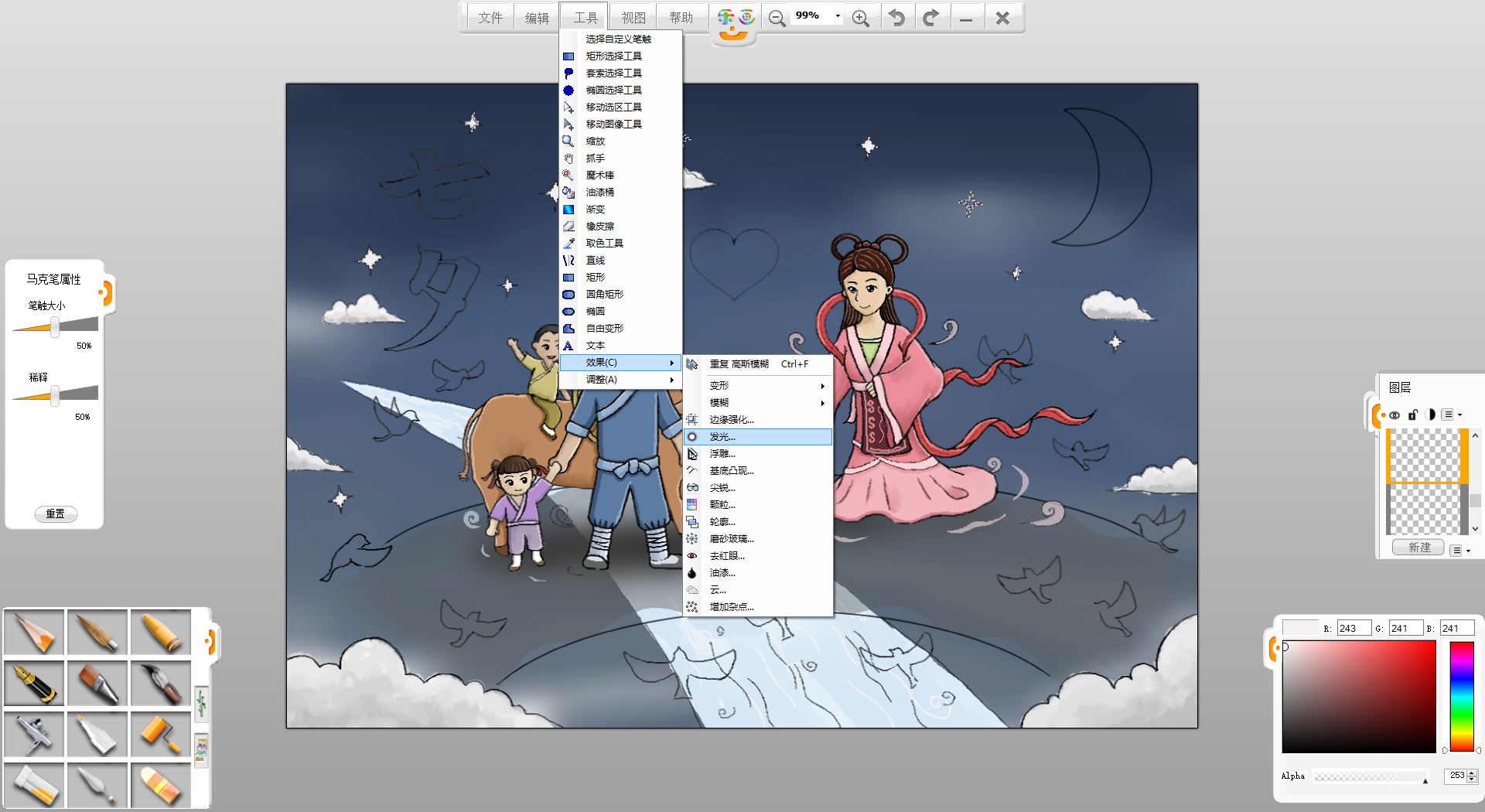 20.使用魔术棒和油漆桶工具为星星填色后,在工具菜单下,使用“效果”-“发光”工具,为星星增加发光效果。