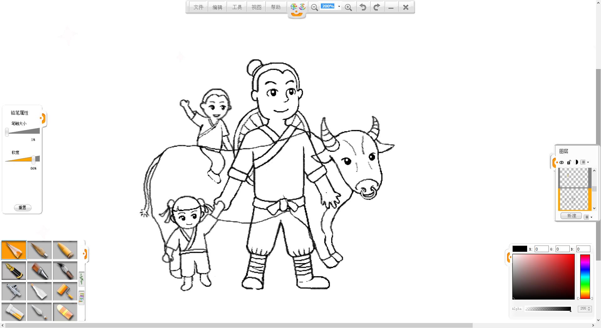 5.继续使用铅笔笔触绘制骑着牛的儿子形象。
