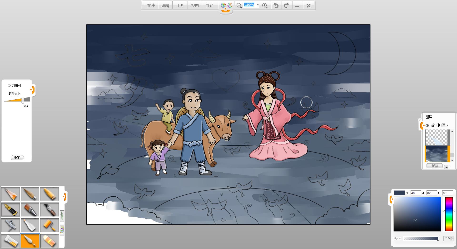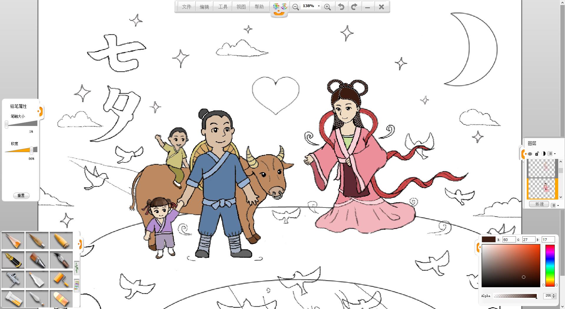 4.在画面左侧使用铅笔笔触绘制一个牵着女儿的牛郎形象。