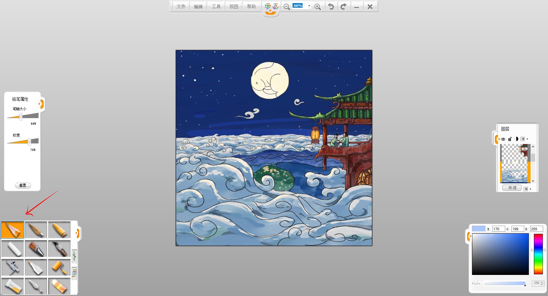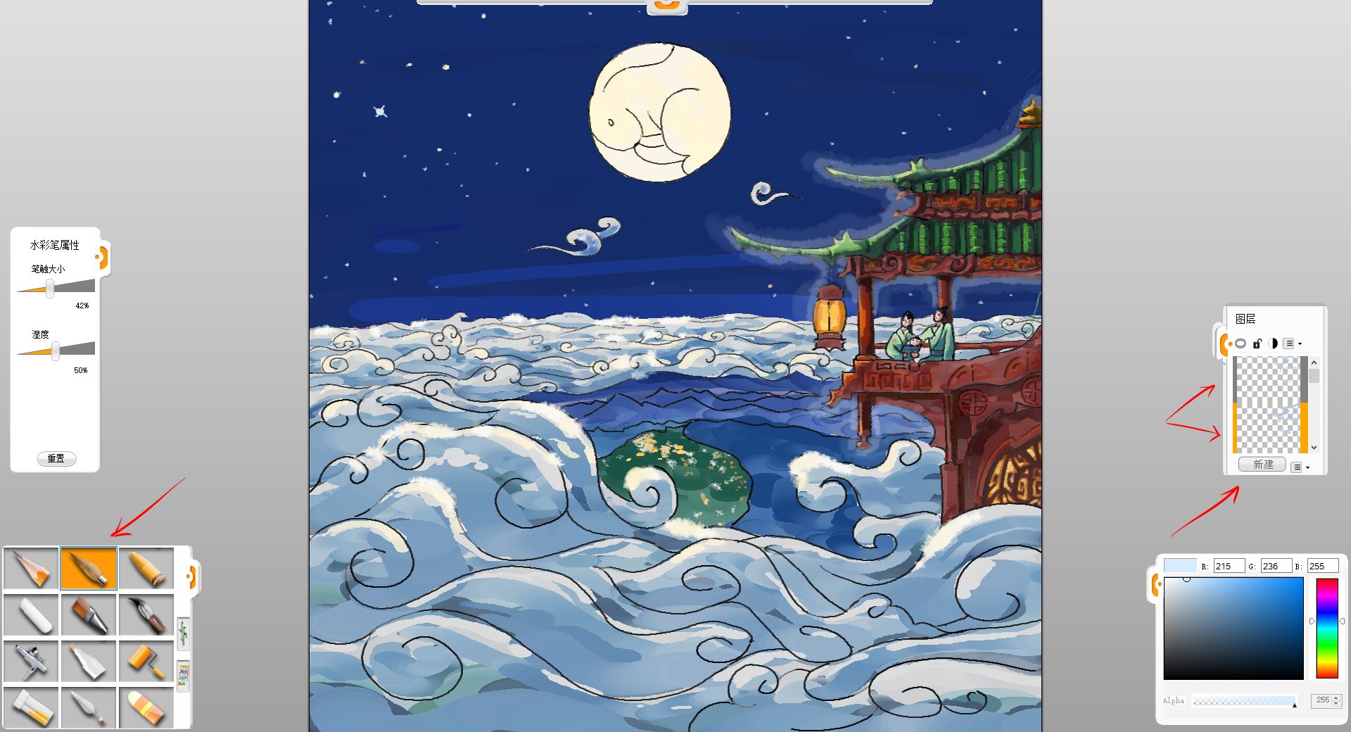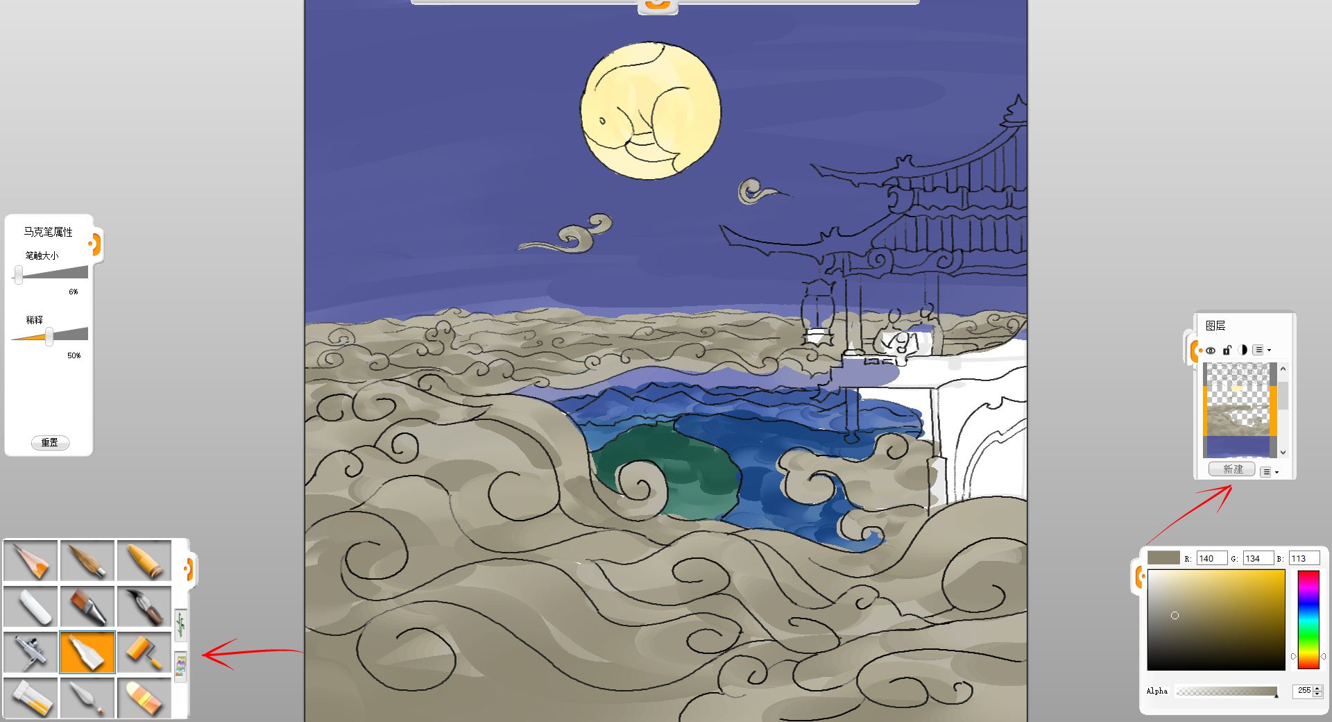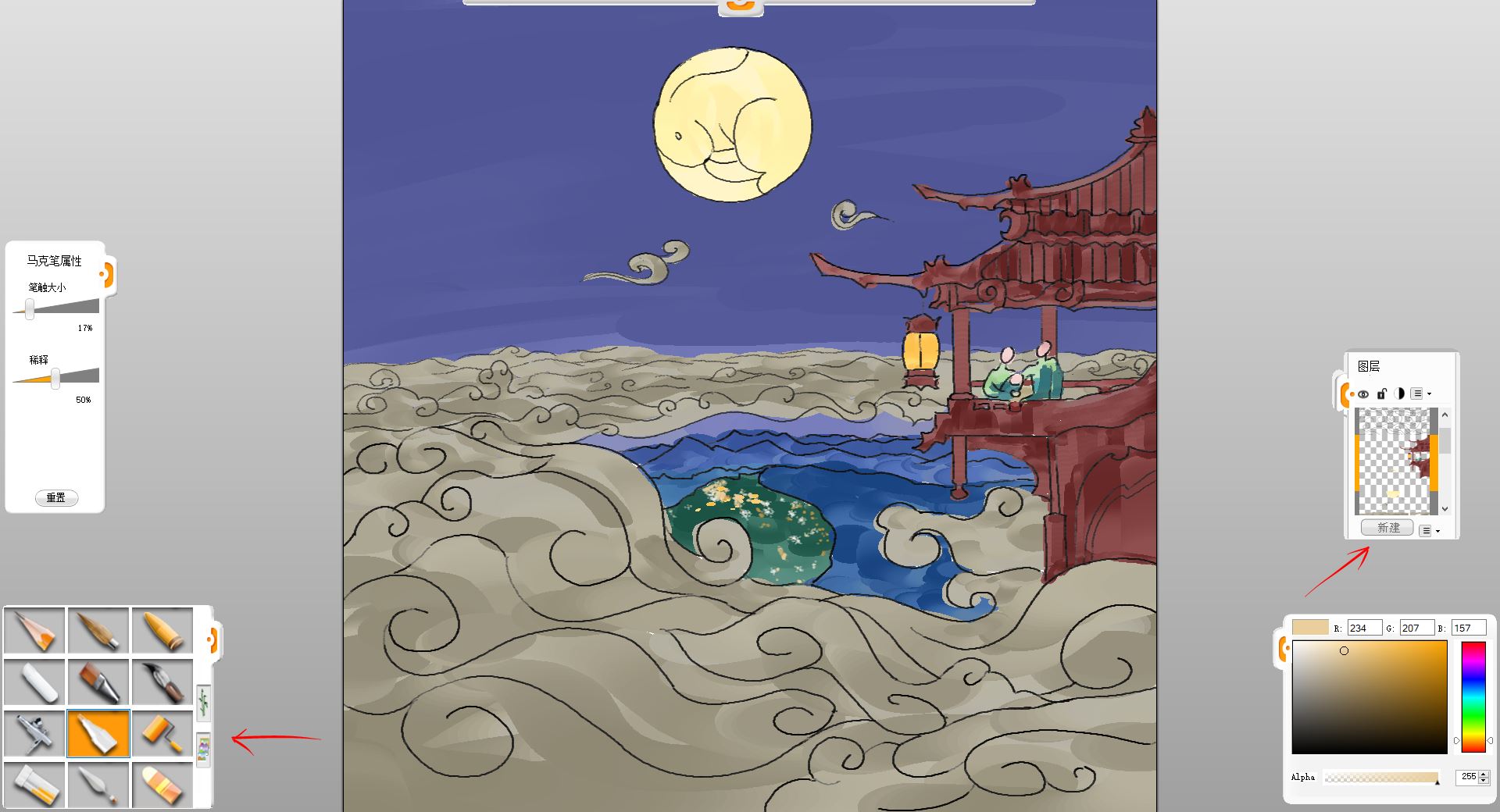 10.新建一个图层,用马克笔笔触给小楼和赏月的一家三口简单铺色。