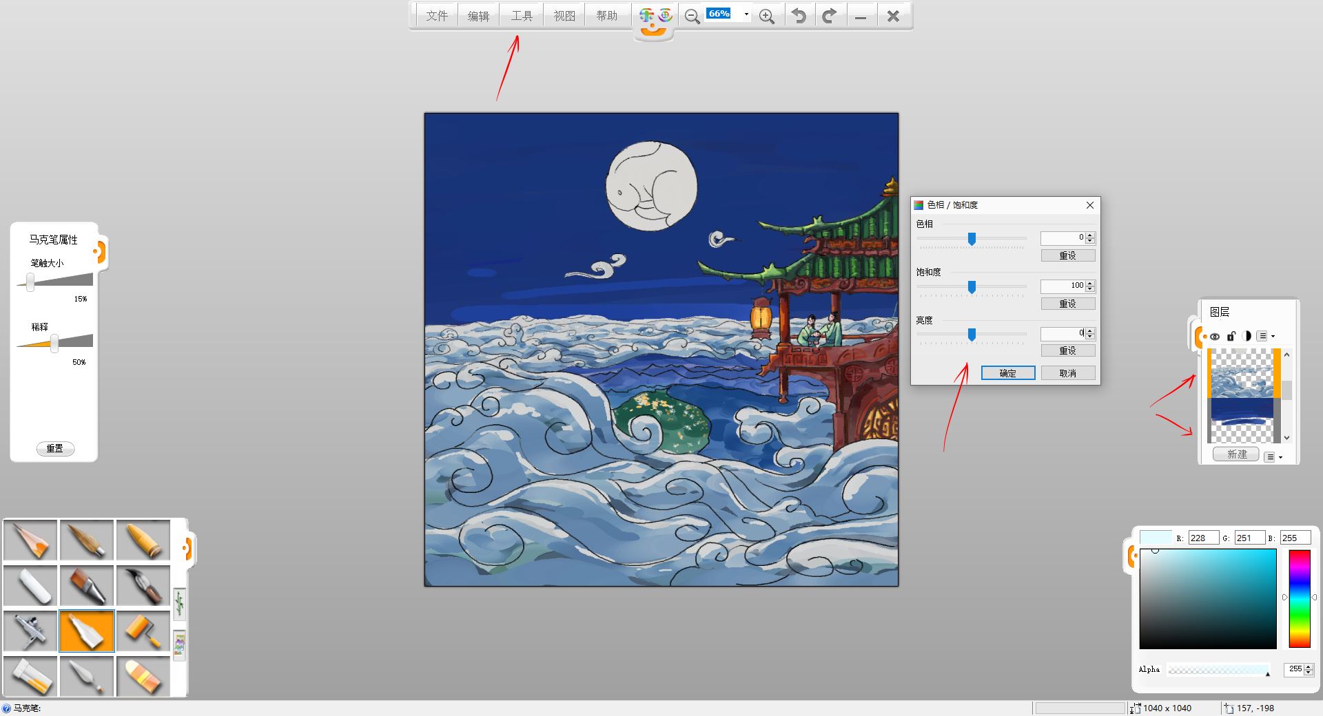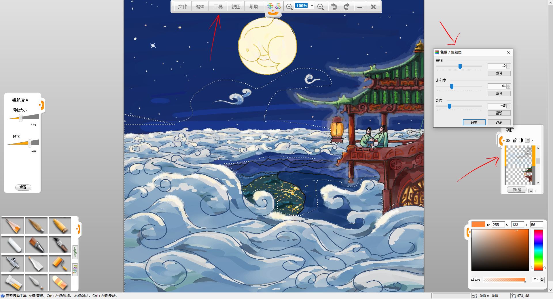 12.用“工具”-“调整”-“色相/饱和度”调整工具,调整云暗面图层的色相,使其更符合环境色。然后合并楼宇,人物图层,使用铅笔工具,刻画建筑图案和阴影等细节,对着月亮和灯笼的一面偏亮,背着的一面偏暗,线稿也可以稍作调整。