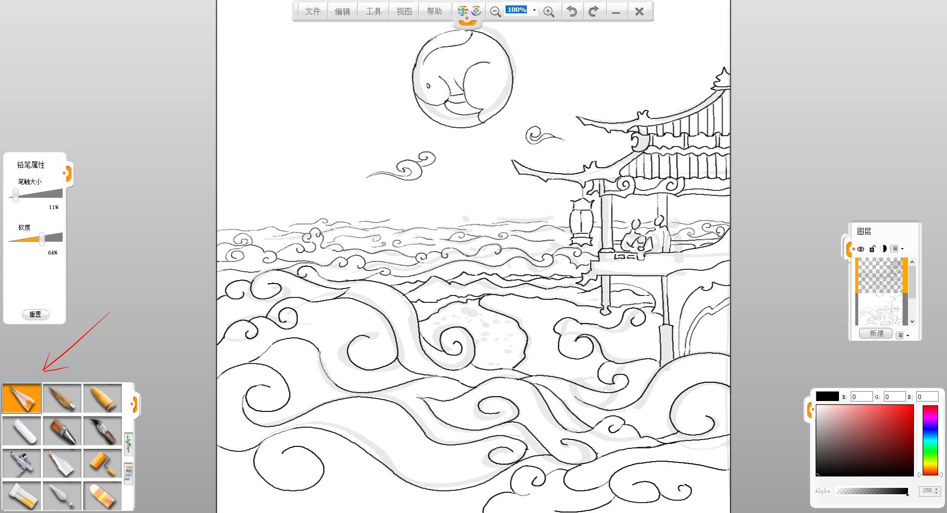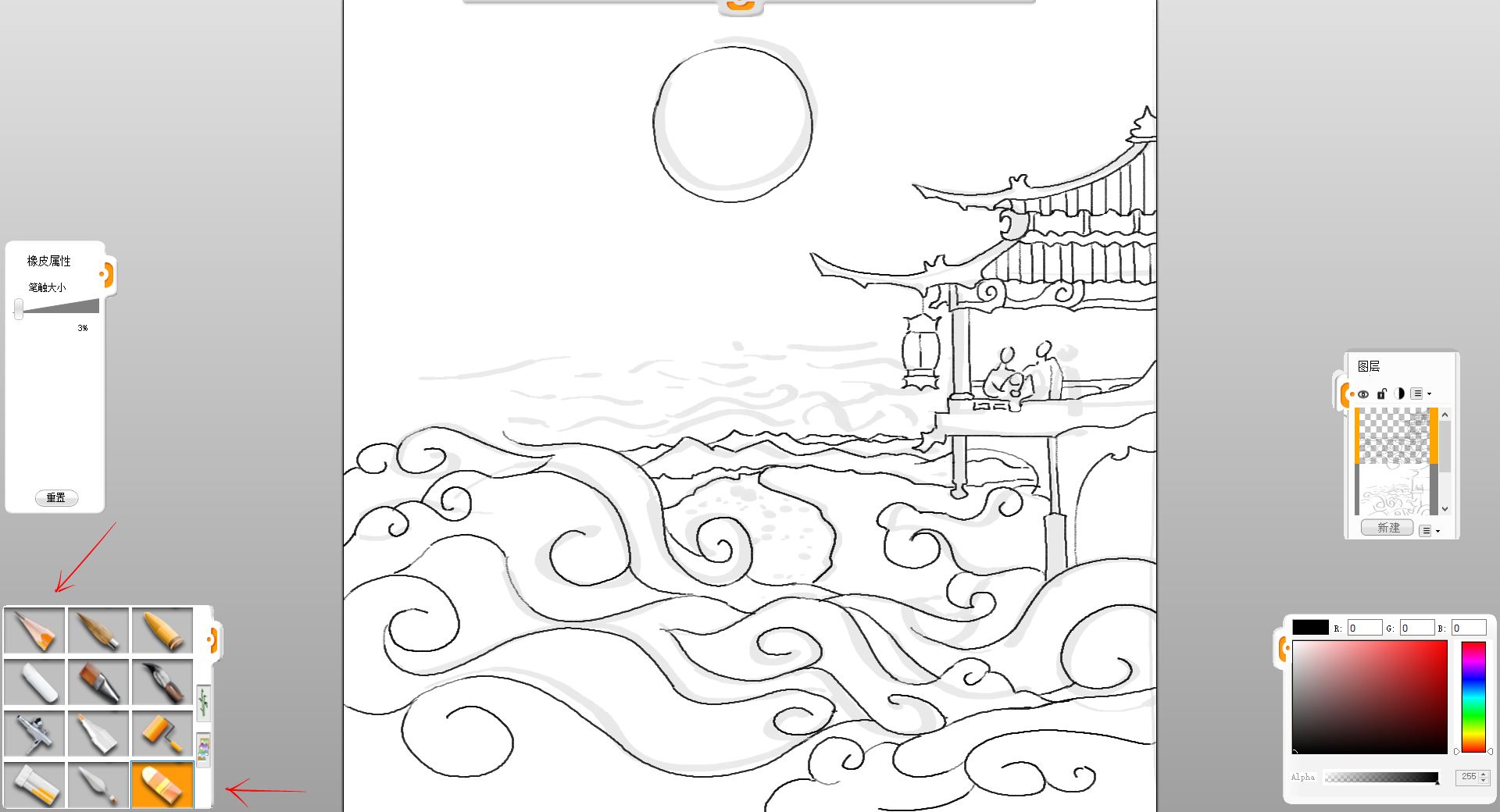 6.用铅笔笔触绘制阁楼、人物、近处祥云的和云下小城的轮廓,配合橡皮擦笔触修改。