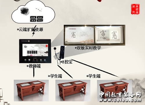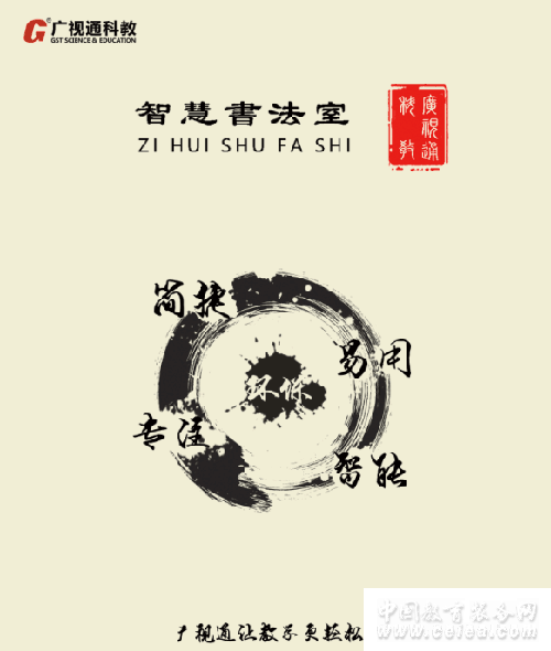 智慧书法教室是云资源智慧书法教室简称,是广东广视通科教设备有限公司自主设计研发的以“平台+终端+服务”为基础研发理念,整合海量书法资源,融合云计算、物联网、无线传感、神经元等新一代信息技术并有效结合了中国的传统文化打造的数字书法云系统,旨在解决目前书法教育面临的困难,有效的提高了书法老师的教学效率、提升了学生的书法学习兴趣,推动书法教育在全国中小学普及的进程,提高目前书法教学的整体水平。广视通智慧书法室把软件和硬件完美结合,使书法教学标准化、规范化、流程化、数字化、高效化,在实际教学中能让老师如虎添翼,是现代书法教学中不可或缺的一套教学装备。