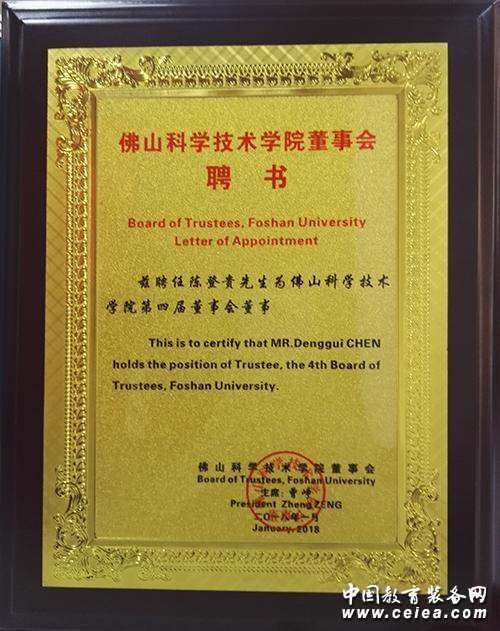 热烈祝贺广东广视通科教设备有限公司董事长陈登贵先生受聘为佛山科学技术学院第四届董事会董事。未来,广视通将积极参与学校的改革发展,支持学校人才培养和基本建设,实现“双向受益、共同发展”。