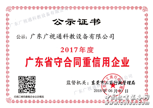 近日,广东广视通科教设备有限公司顺利通过了广东省工商行政管理局评审,获得了2017年度“广东省守合同重信用企业”荣誉称号,这也是广视通第7次获此殊荣,此前广视通曾在2010年度、2012年度、2013年度、2014年度、2015年度、2016年度六年获得该荣誉称号。