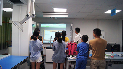 在公司的相关负责人的带领下,小狮子和家长们依次参观了创新教育装备体验中心各个展厅,如智慧书法教室、云资源实验教学平台科普体验馆、数字地理教室、心理咨询室、创客及3D打印室等高端智能装备,琳琅满目,集实用性和趣味性于一体,备受孩子们喜爱。孩子们体验着每一项展品,时而翘首张望,时而亲身操作。“这个是什么?”、“这个球怎么会发光?”……孩子们对每一件展品都充满了好奇,不时提出各种问题,工作人员也竭尽所能为孩子们耐心风趣地解答。