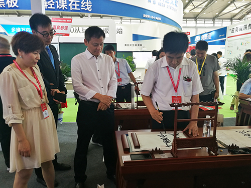 教育部关心下一代工作委员会常务副主任、中国教育装备行业协会会长王富莅临展位,体验智慧书法教室并给出高度评价。