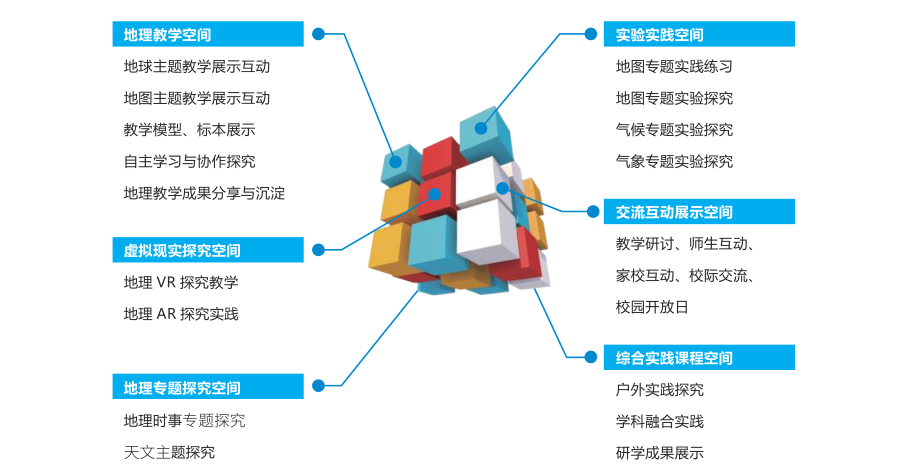 我们可根据学校实际情况,按需建设地理学科专用教室。依据地理学教育装备配置规格,方案将设备配置划分为基础型配置、探究型配置及拓展型配置三大类型,学校可以选择在单一空间内配置一种或多种配置类型,也可以将多个配置类型在多个空间内分布式建设,支持学校建设更加适用、好用和实用的教学空间。