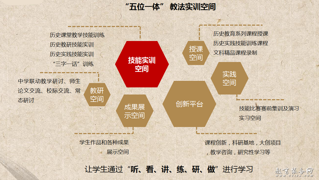 高校「历史」教法实训室则是专为历史专业师范生提升教学技能训练的实训场所,是历史专业师范生进行教学、实践、技能训练、教育见习、教育演习、教育实习、教育研习、学术研究、学术研讨、大创项目等的综合性基地和创新平台。通过建设基于现代教育技术创新科技成果、始终坚持实践育人为原则的历史教法实训室,使之成为培养高素质历史师范人才的重要平台。
