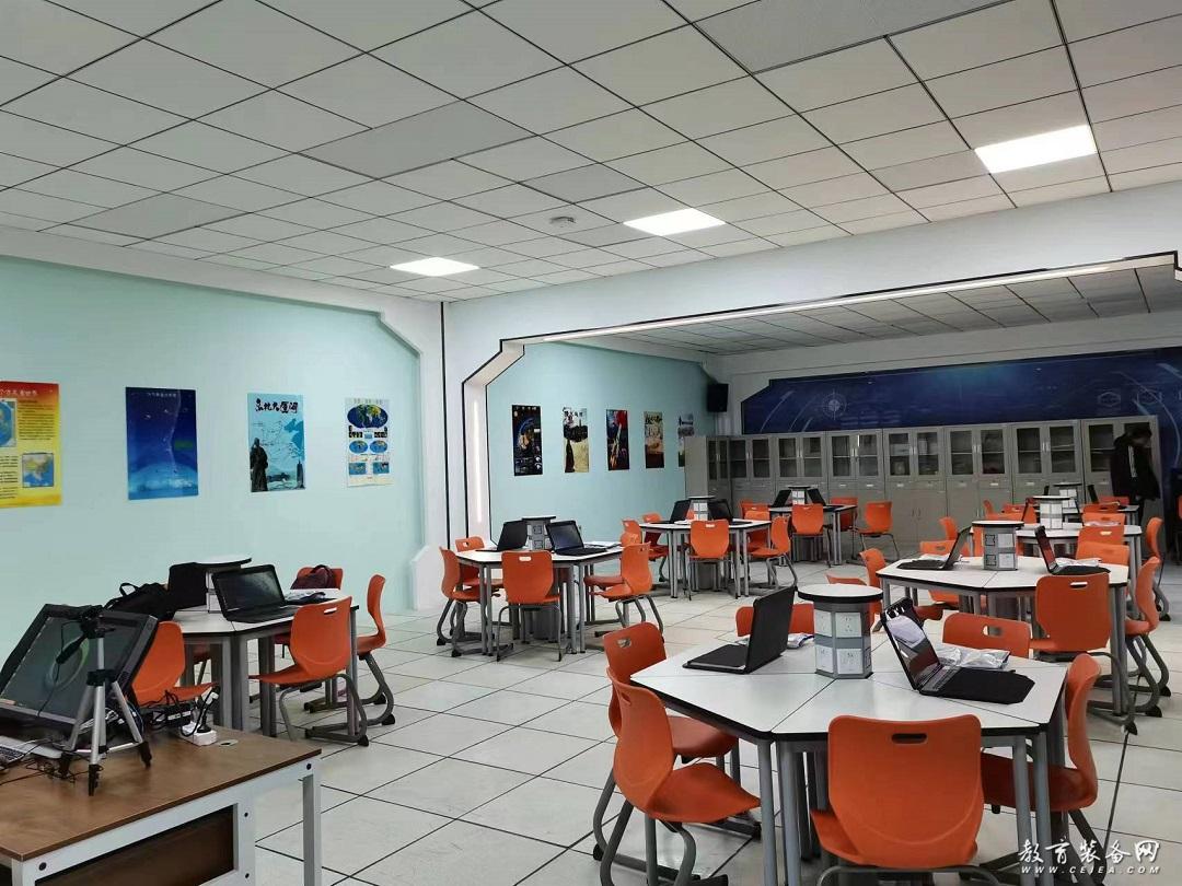 整间教室包括中教启星VR一体机(教师机)及启星VR移动课堂(学生端),配备大量高中地理、历史、理化生等五个学科的VR教学资源。辅以极具虚拟现实特色的窗帘、背景墙和知识展板,整体现代风的环境设计十分引人注目。