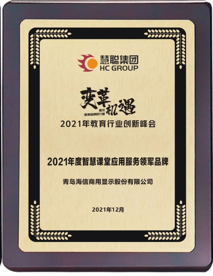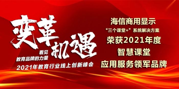 今天下午,由慧聪教育网主办的2021年教育行业线上创新峰会盛大举行。此次创新峰会,以用户为主线,以场景为导航,以政策为引导,甄选出新教育生态下的品牌,由此诞生了2021年教育行业创新品牌榜单。榜单涵盖了智慧教育应用、行业品牌创新、健康校园应用以及科技赋能教育四大版块,海信商用显示公司“三个课堂+”系统解决方案荣获2021年度智慧课堂应用服务领军品牌奖。