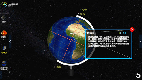 综合运用3D立体图、平面图、语音等多种形式,直观、详细描述经度、纬度、地球的自转公转、板块、火山等地理知识,让学生对全球地理知识有概况把握。