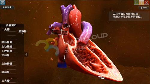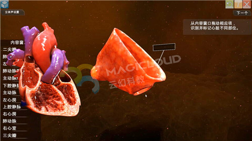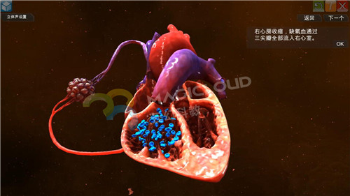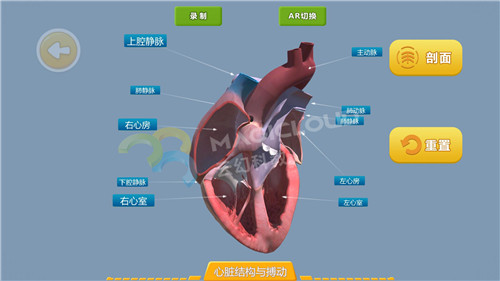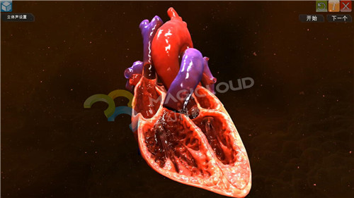 如《心脏和血液循环》课程中,云幻科教3D互动教学资源中,首先教师可以给学生展示3D教学视频,跟随着视频了解心脏的结构、血液流动所经过的部位、形成的循环体系等等;其次再通过互动部分对心脏部位进行拆分学习,跟随着血液经过的体循环与肺循环相关部位,对心脏和血液流动形成深刻的认识。学生不仅可以局部放大,还可以操纵鼠标使其在三维层面上任意方向任意角度的观察。