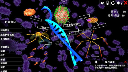 云幻科教3D互动教学资源中,《病毒》课程包含视频、互动、练习三个部分,教师可以通过播放3D视频让学生们了解病毒的类型、结构、繁殖等相关知识,其次可以通过互动部分内容对病毒的结构进行拆解学习,了解每个部位的功能设置等,最后可以通过练习部分回顾本节课的主要内容以及进行测评,评估学习者本节课知识内容的掌握程度。