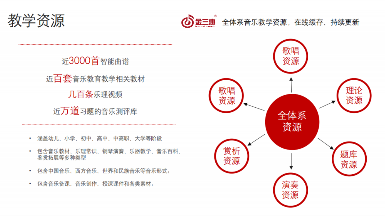 金三惠数字音乐教育综合平台,发挥现代信息技术的作用,通过丰富的内容和智能化的功能,解决乡村美育教师均衡化问题,提升教师数字素养,辅助非专业音乐教师完成音乐课教学,让专业的音乐老师上课更轻松。