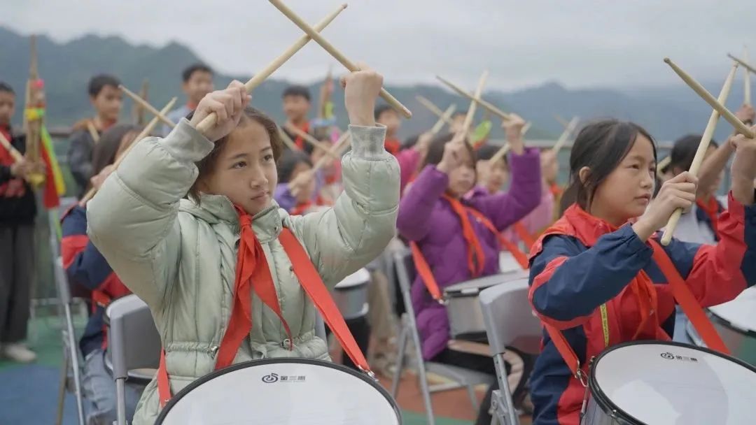 △图为“金三惠”为贵州省方良小学建成的鼓号队捐赠器材