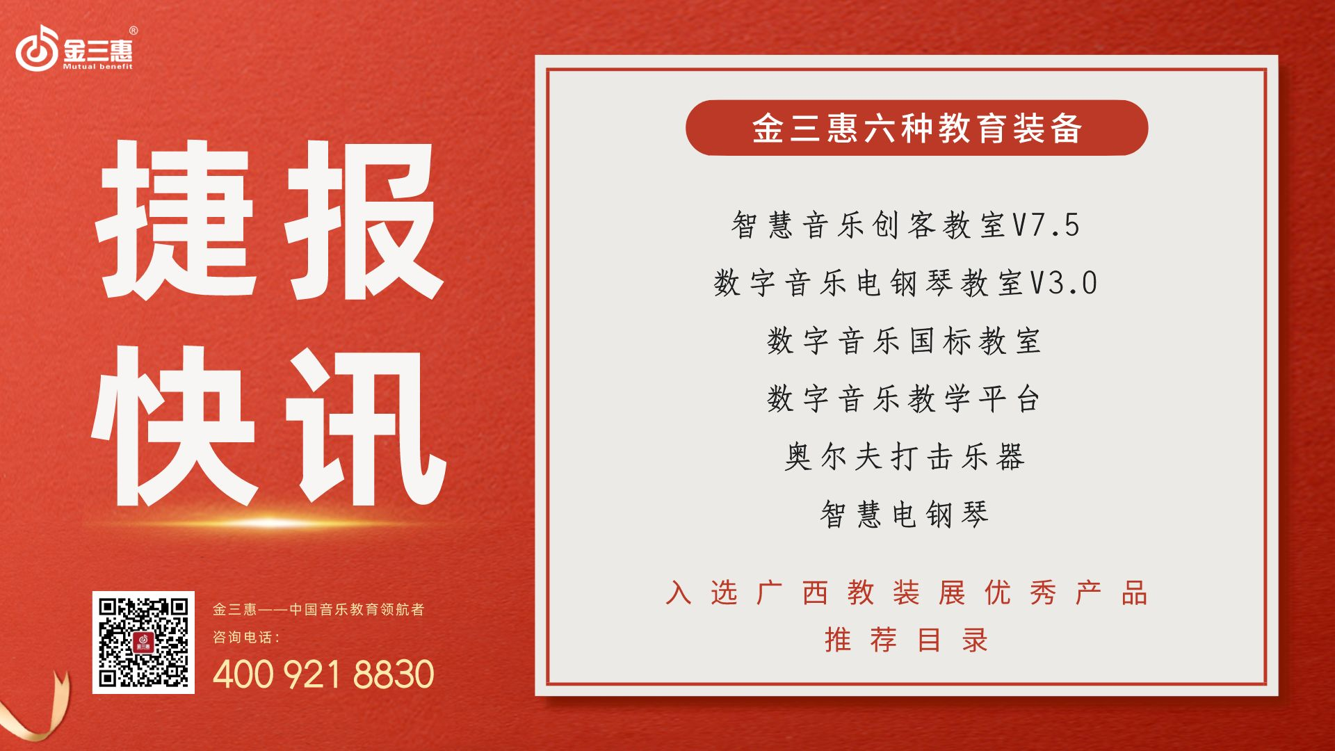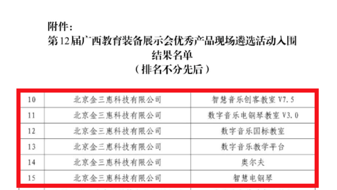 2023年8月10日,广西教育装备行业协会发布《关于公布第12届广西教育装备展示会优秀产品现场遴选活动入围结果的通知》,金三惠自主研发的六种教育装备——智慧音乐创客教室V7.5、数字音乐电钢琴教室V3.0、数字音乐国标教室、数字音乐教学平台、奥尔夫、智慧电钢琴从众多参评产品中脱颖而出,荣誉登榜!