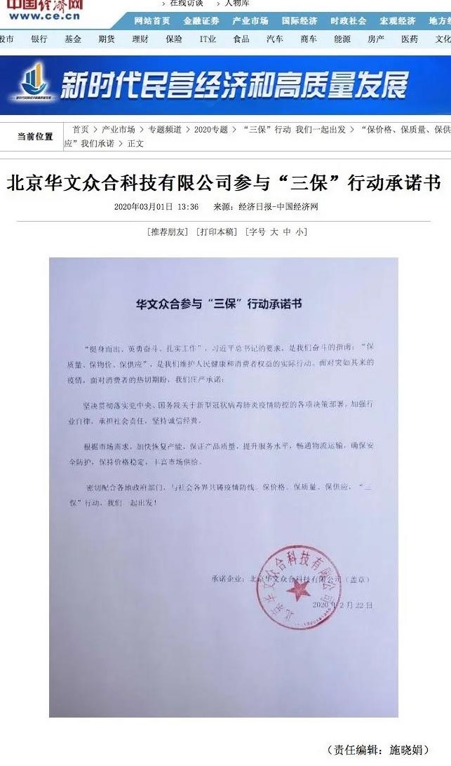 近日,市场监管总局通过视频会议启动“保价格、保质量、保供应”系列行动(以下简称“三保行动”),希望企业要把对社会的庄严承诺兑现为实际行动,“言必信、行必果”,始终把责任挺在最前面。“三保行动”启动以来,阿里巴巴、伊利集团、今日头条、纳爱斯、稻香村、华文众合等众多富有责任心的企业,积极响应“三保行动”,安全、有序、分批组织复工,加快恢复产能,维护市场稳定,齐心协力,为疫情之战保驾护航。