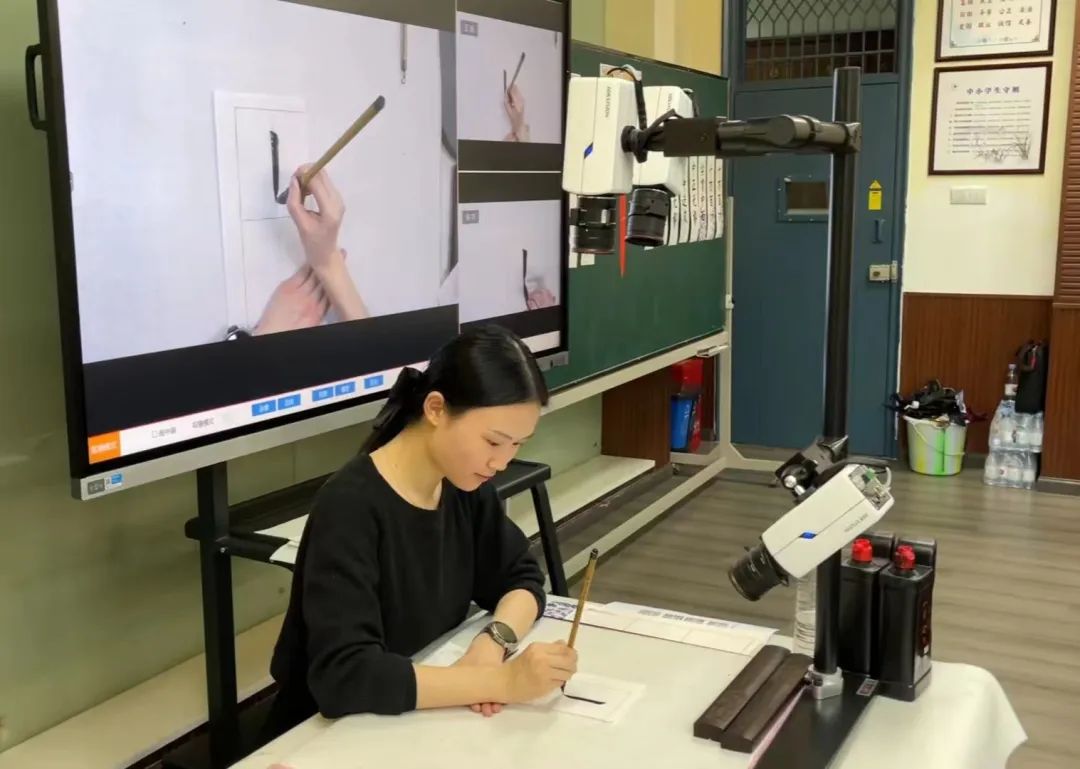 在活动现场,授课教师何悦利用华文众合智慧书法教室为学生们上了一节别开生面的书法课”。通过直播授课把“悬针竖”的起笔、行笔、运笔、收笔从三个角度进行展示,并同步到每个学生端;通过互动系统更清晰快速地指导学生的书法练习细节;通过边看边练让学生的书法临摹变得更高效。应用华文众合智慧书法教室的各项功能,很好地展示了书法教学细节,提升了书法教学质量。