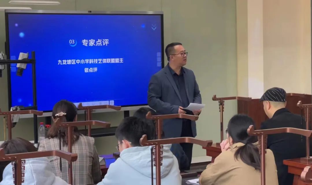 九龙坡区中小学科技艺体联盟盟主、园区小学副校长赵承作做了现场点评,充分肯定了智慧书法的优点,用“智慧赋能书法教室”诠释了智慧书法教室所带来的便利性。