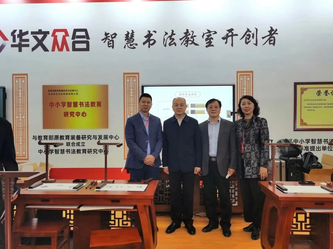 河北省教育装备行业协会会长郭国维(左二)、河北省教育厅装备中心主任郭晋宝(右二)、河北省教育装备行业协会秘书长郑秋辉(右一)莅临华文众合展位指导