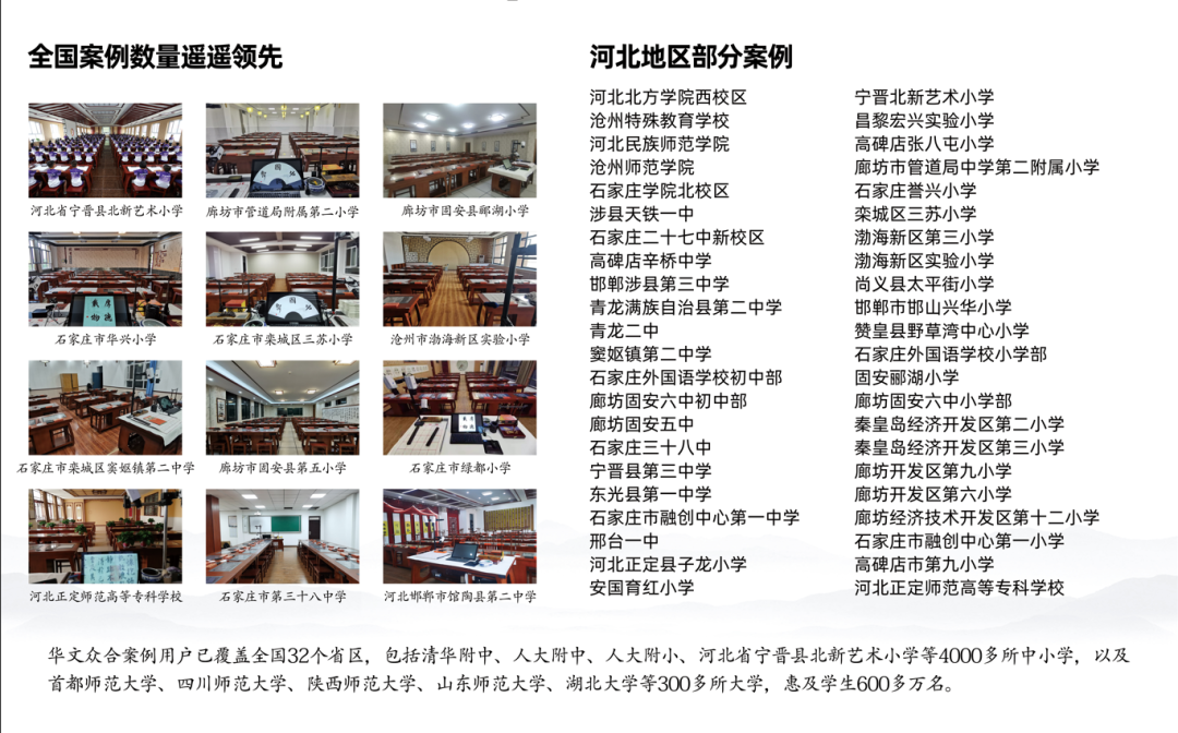 华文众合多年来不遗余力致力于智慧书法创新,让传统书法文化在新时代以数字化、智能化的方式得以发扬与传承。此次河北教育装备展,华文众合第8代智慧书法教室、智慧粉笔教室的出彩表现让我们看到了书法教育现代化的新希望。华文众合始终在智慧书法领域不断研发创新,为师生做好书法教育服务工作,实现助力书法教育高质量发展。目前,华文众合智慧书法教室案例数量覆盖全国32个省区4000多所中小学、300多所大学,其中包括清华大学附属中学、中国人民大学附属中学、中国人民大学附属小学、首都师范大学等名校,惠及学生600多万名。
