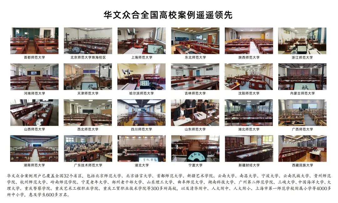 截至目前,华文众合智慧书法教室已走进全国32个省区,包括综合类、师范类、理工类、职业院校等在内的300多所高校以及4000多所中小学,例如北京师范大学、北京语言大学、首都师范大学、新疆艺术学院、云南大学以及清华附中、人大附中、人大附小、上海市第一师范学校附属小学等。