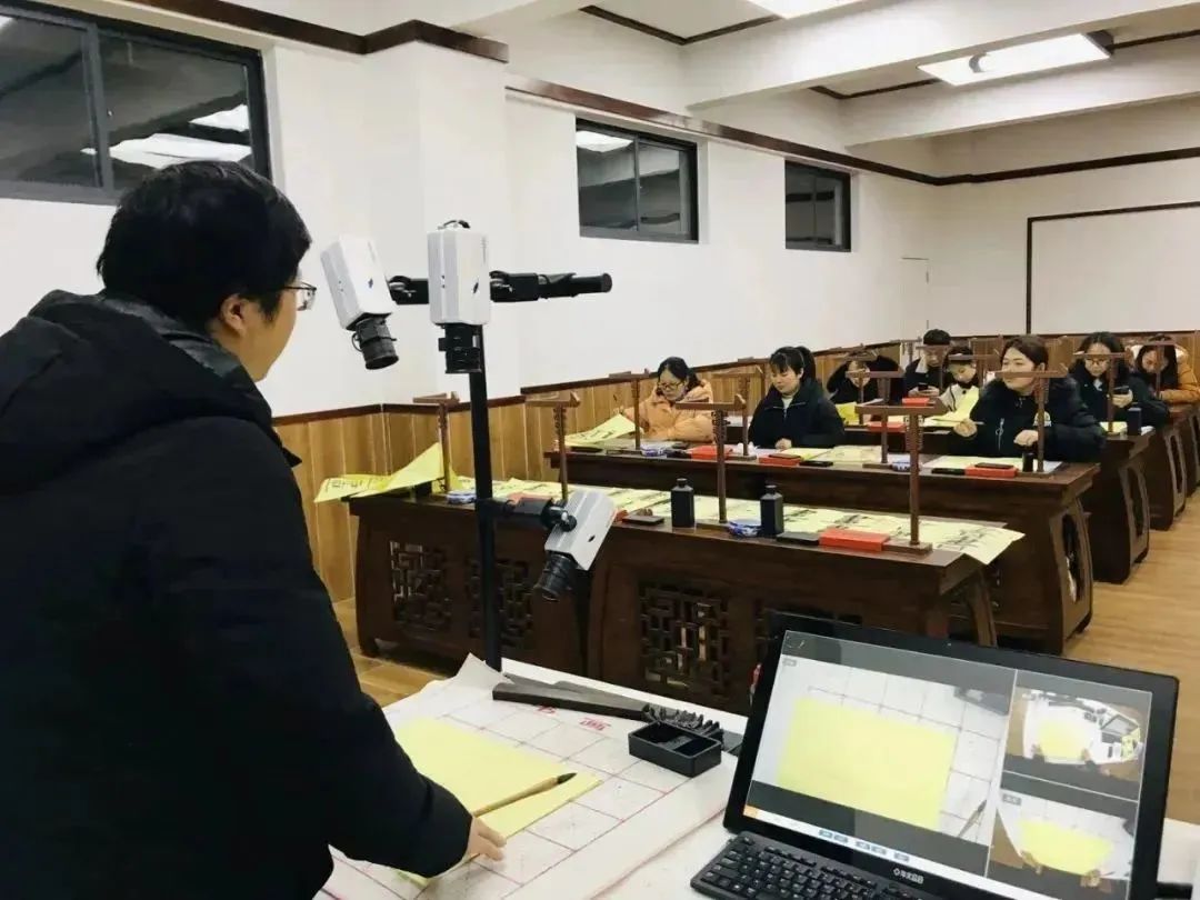 书法培训在学校智慧书法教室开展,电子点签、资源获取、书法直播、板书示范和教学互动等科技与传统相结合的智慧书法新模式让老师们纷纷感叹。