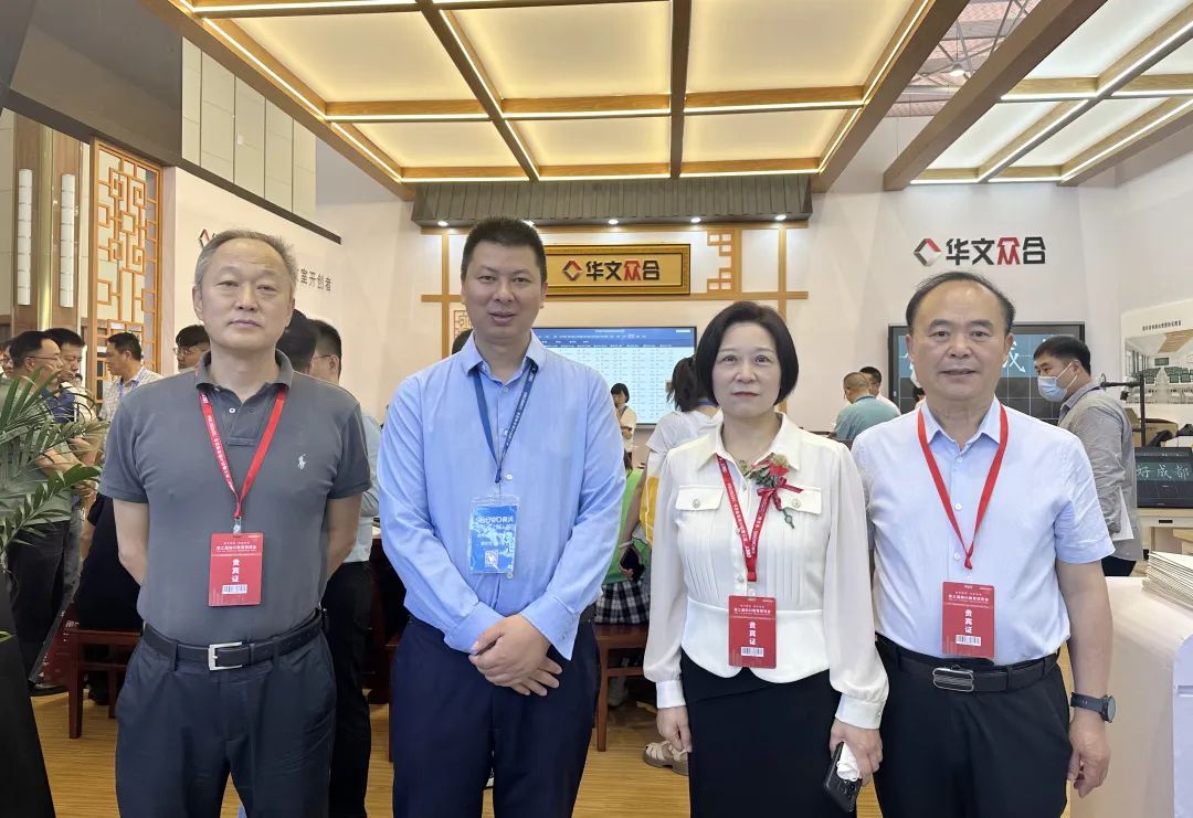 河南省教育厅机关服务中心主任姜燕(左一)、河南省教育资源保障中心副主任孙艳红(右二)、河南省教育装备行业协会会长林忠培(右一)莅临指导