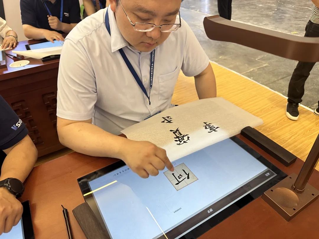华文众合第8代智慧书法教室采用数字信息化技术,解决了书法师资力量不足、书法课程体系缺位等难题,让教师能够系统地为同学们上好每一堂书法课,不再受传统书法教学的限制,大大提高了学校的书法教学效率。华文众合交互式数字临摹台,在硬件方面满足了学生数字信息化摹帖、临帖的需求。华文众合智慧书法教学系统内置从先秦到近现代近十万张碑帖、古诗、篆刻等资源,便于学生师从古人及现代书法家。为了解决书法教学中老师示范困难的问题,华文众合请书法名家亲自录制教学示范视频,对学生实现一对一教学。同时,对于专业书法老师,可以通过“笔尖跟踪功能”进行书写示范,借助直播软件,学生可以直接在座位上清晰观看学习老师的运笔细节。此次展会,华文众合第8代智慧书法教室展现了最新研发成果“Ai评价功能”——针对学生的书法练习,智能Ai评价从笔画、结构方面对学生的书写进行专业评测指导,给予纠错建议。“Ai评价功能”在书法教学评价环节成效卓著,可以帮助学习者快速提高进步,通过人工智能技术让师生拥有一对一名师教学的体验。华文众合智慧书法教室通过各类智能装备辅助书法教学内容呈现,便利书法学习资源获取,促进课堂交互开展,助力推动未来书法教育进程。