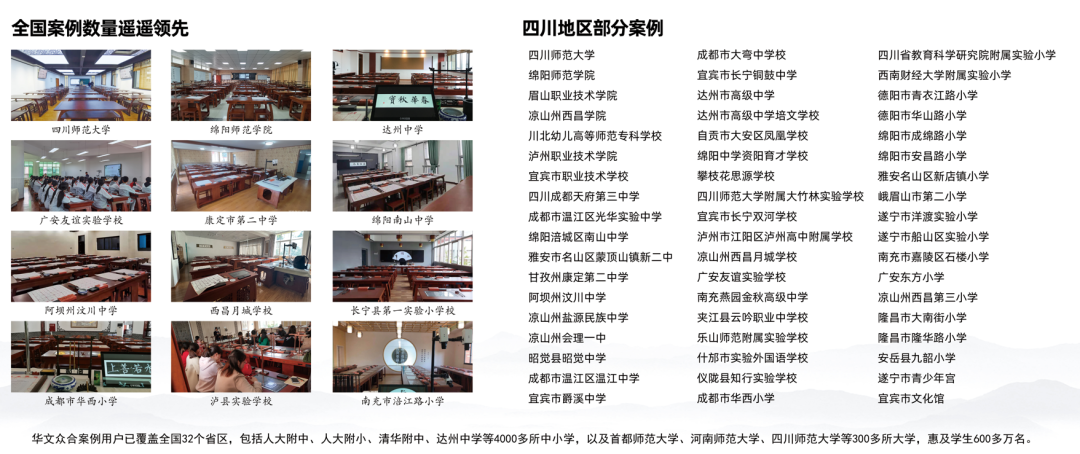 “双减”之下,学校和社会都要为学生的全面发展撑起一片天。书法教育作为素质教育里的赛道之一,自然成为学校发展优质课后服务的焦点。华文众合智慧书法教室使传统与科技相结合,既注重技术的先进性,又注重教学的先进性。也正是因为这些理念,让华文众合的产品在此次四川教育博览会上大放异彩,获得广大校长、老师等教育界人士的一致好评和认可。目前,华文众合的智慧书法教室已经覆盖全国32个省市及自治区,有4000多所中小学案例、300多所高校案例,其中包括清华大学附属中学、中国人民大学附属中学、中国人民大学附属小学、首都师范大学等名校,惠及学生600多万名。