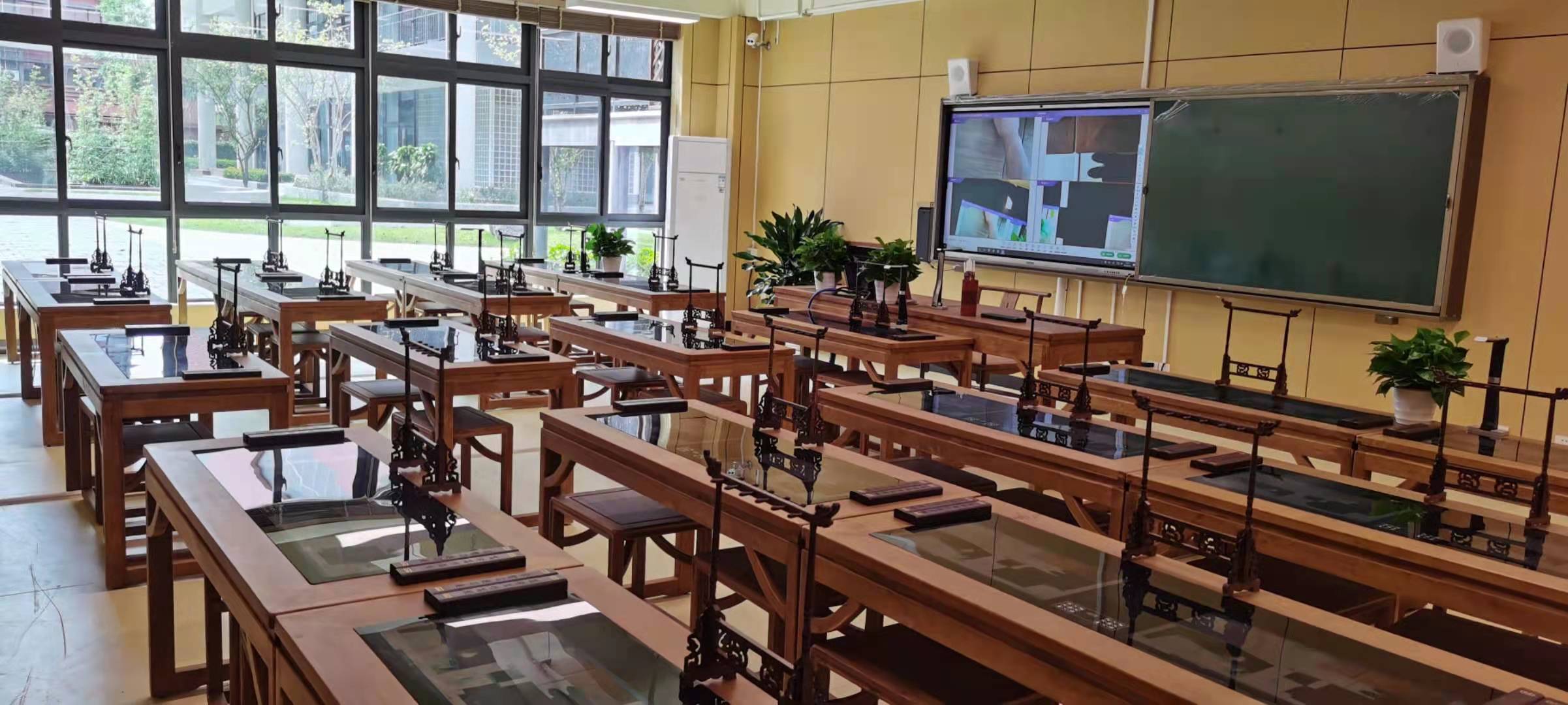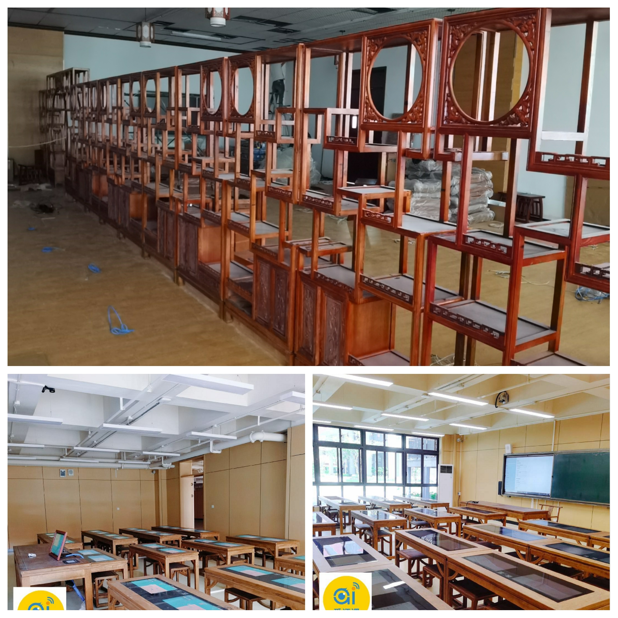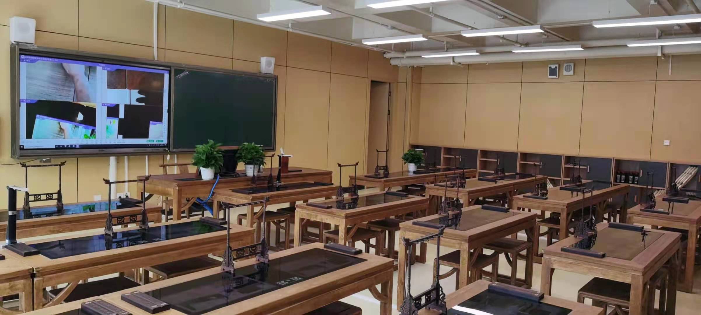 教室布局、开槽网线弱电、吊顶、灯具、老师示范设备、学生临摹屏、互动主控设备、厚重的实木中国风桌椅,夹水晶头、每根网线、座位临摹屏、学生终端、笔洗笔挂,都凝聚了施工同事的责任和坚守。