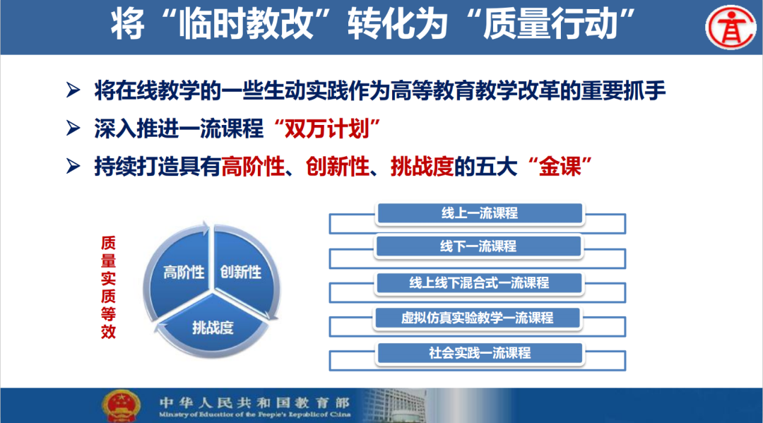 【摘要】近期部分高校开学复课,“金课”建设再次提上日程。当前期间的线上教学能经验能为“金课”建设提供哪些帮助?混合式教学对比传统教学又有哪些优势?