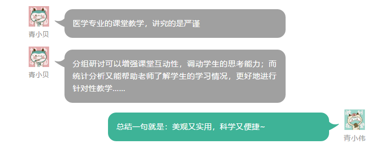 校内建设的研讨互动智慧教室,集课堂互动、分组研讨、统计分析、课程直录播、以及对教学周边环境的智能化的调节等功能于一体,未来可以满足学校多样化的教学需求,助力推动学校“医科”人才培养教育的综合改革。