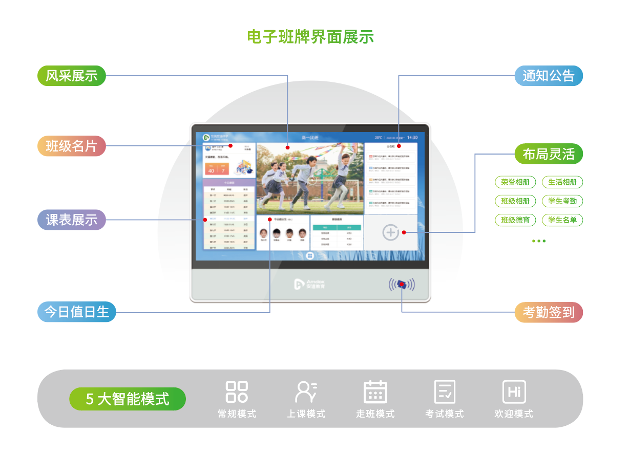 作为教育行业领先的设备制造商和解决方案服务商,安道教育不断思索教育和学习的本质,深入到学校,真正理解师生需求,针对学校、老师、家长、学生不同角色的多种需求,为此推出的安道云班牌,是专为学校打造的校园文化建设、班级考勤、班级信息展示的信息化产品,具有展示校园文化、班级文化、学校安全教育、班级考勤、课程安排、活动资讯、通知信息等辅助教学功能,搭建家校沟通桥梁,促进家校共育,助力校园信息化建设。