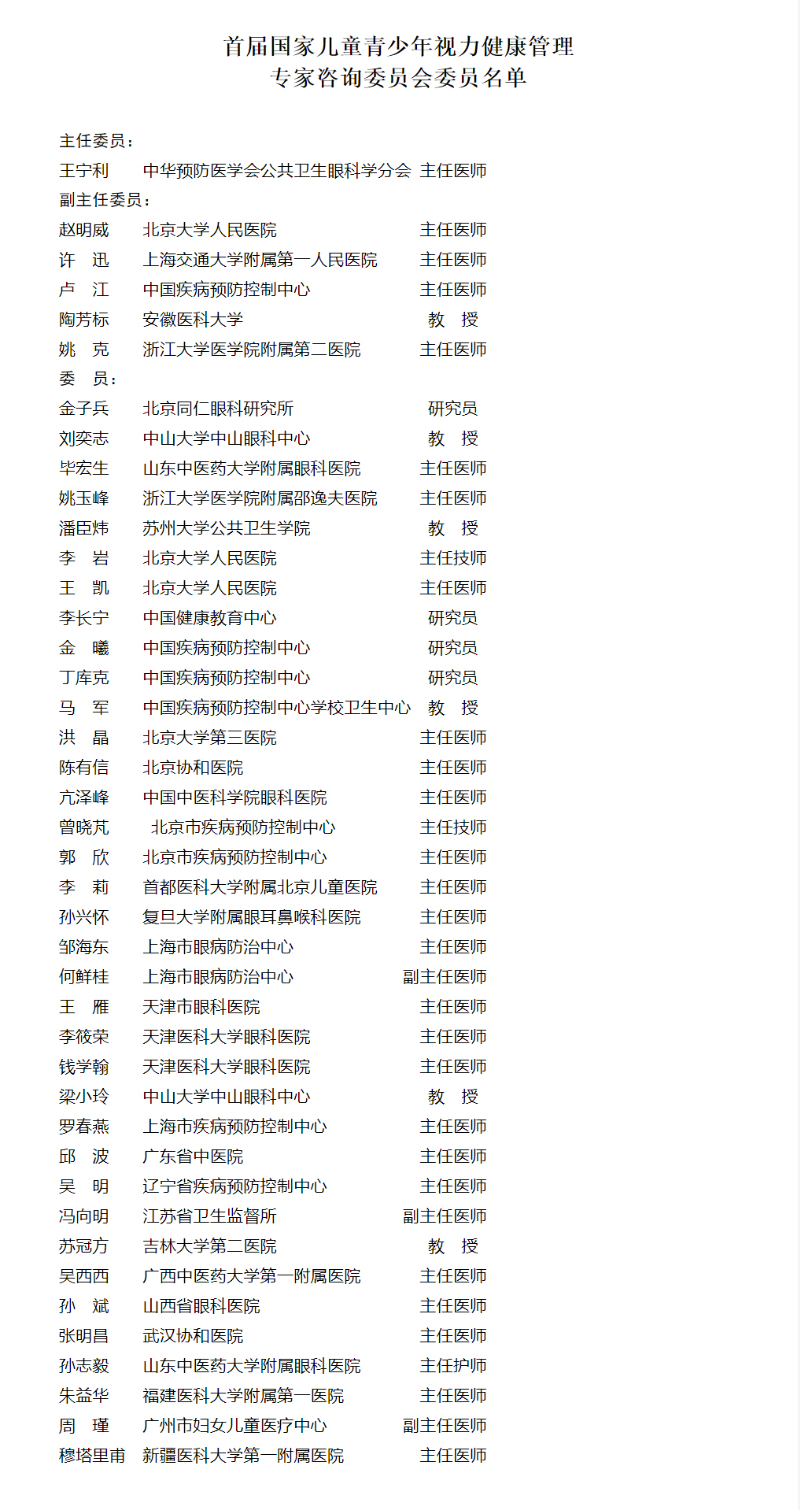 附首届国家儿童青少年视力健康管理专家咨询委员会委员名单