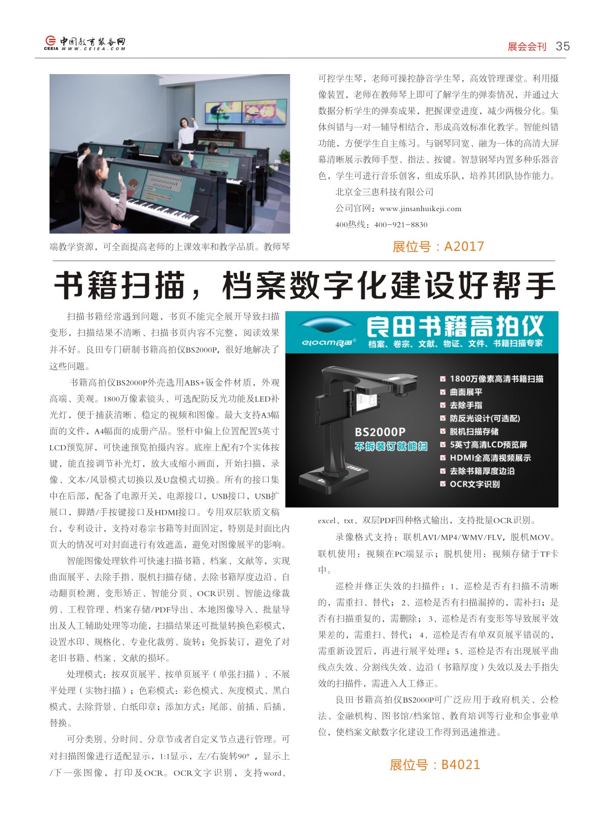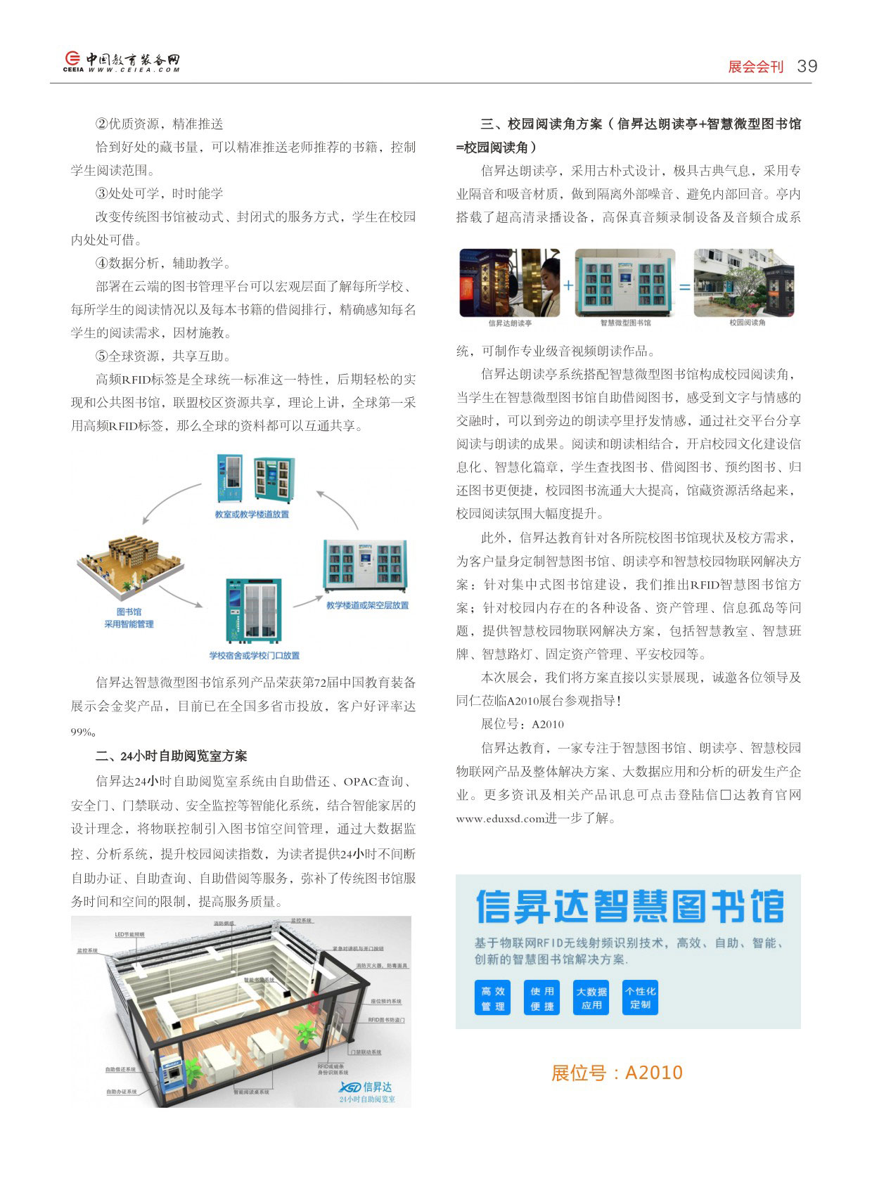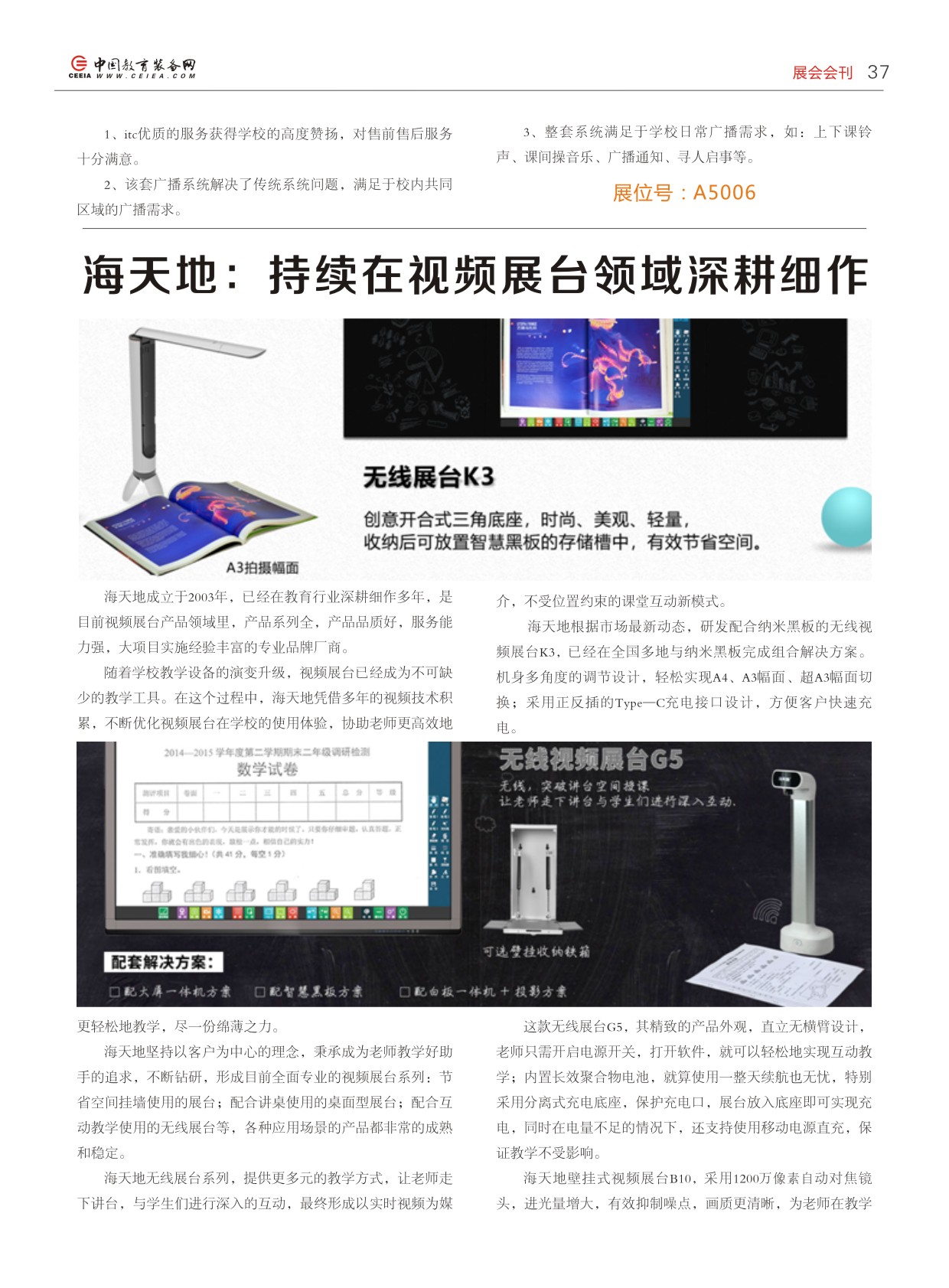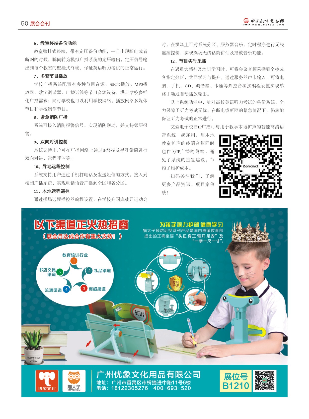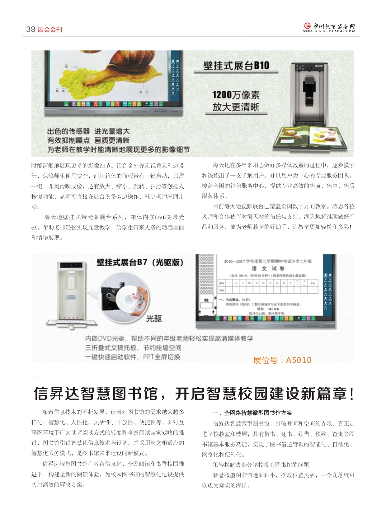 为更好的服务展会、服务企业、服务参展观众,教育装备网围绕“提供展会活动指引,突出参展企业亮点”为宗旨,精心策划制作了《中国教育装备展示会展会特刊》(以下简称《特刊》),于展会期间,现场发放给行业协会领导、各省参会领导、代表以及现场观众。